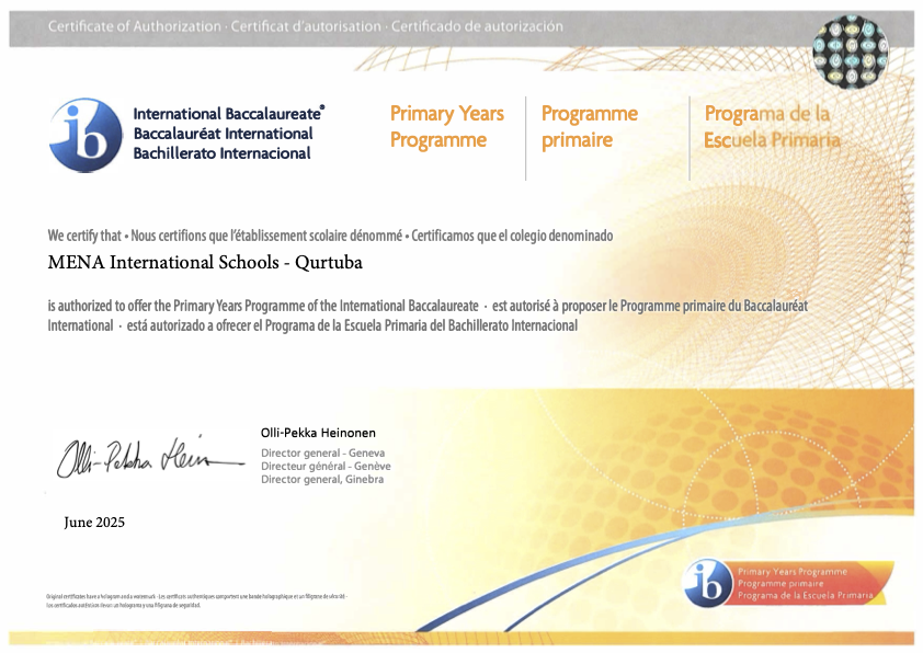 We are thrilled to announce that MGIS Qortuba is now officially an authorized IB World School for the Primary Years Program (PYP), marking a significant milestone in our commitment to academic excellence and our vision to provide a world-class education for your children.